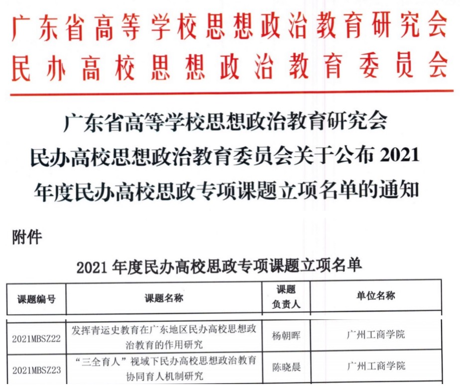 【本网讯】10月21日, 根据《广东省高等学校思想政治教育研究会民办高校思想政治教育委员会公布2021年度民办高校思政专项课题立项名单的通知》,ky开元马克思主义学院杨朝晖老师、陈晓晨博士分别荣获2021年民办高校思政专项课题审批立项。