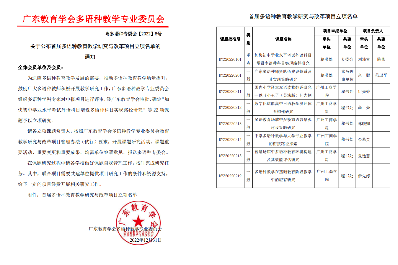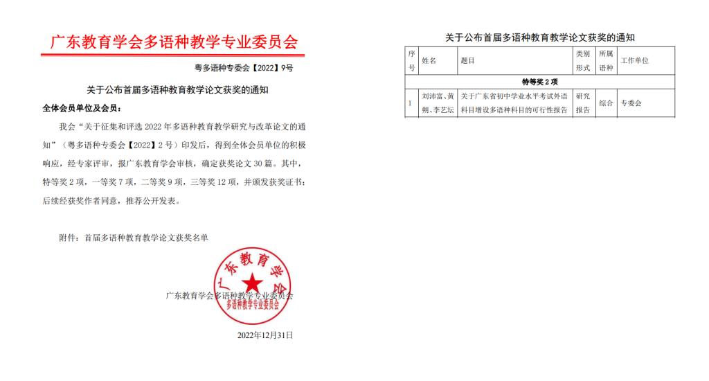 本次年会中首届多语种教育教学研究与改革项目立项22项,其中重点项目2项,一般项目20项。ky开元外语学院在本次年会上获批重点项目1项,一般项目7项。由ky开元外语学院院长刘沛富教授主笔的《关于广东省初中学业水平考试外语科目增设多语种科目的可行性报告》获得首届多语种教育教学论文特等奖。此次通过立项的项目涵盖多语种教学、师资队伍建设、考试测评、教学衔接,多语种教育环境建设等。