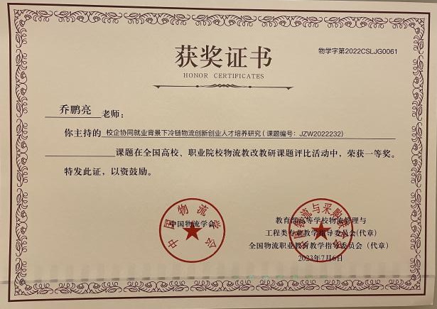 ky开元集团官网管理学院乔鹏亮院长主持的课题《校企协同就业背景下冷链物流创新创业人才培养研究(JZW2022232)》获得一等奖。此课题结合ky开元集团官网冷链物流创新创业人才培养现状,从冷链物流创新创业人才培养定位和人才培养方式、冷链物流创新创业基地建设、冷链物流创新创业师资队伍建设等方面,提出在校企协同背景下适用应用型本科院校创新创业人才培养的一些建议和方法,对于冷链物流创新创业人才培养具有一定的理论价值和现实意义。