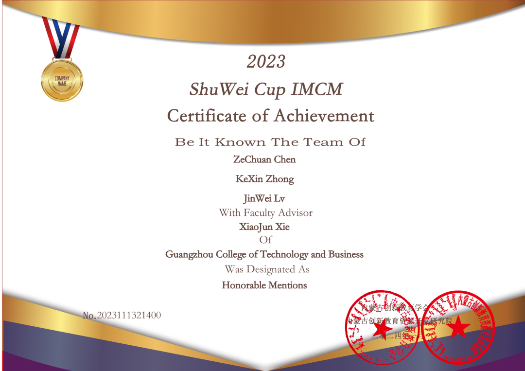 【本网讯】近日,2023年数维杯国际大学生数学建模挑战赛获奖名单公布,学校通识教育学院谢小军教师指导的学生团队陈泽钏、钟可欣、吕锦威在本届竞赛中获得Honorable Mention(二等奖),谢小军获得“优秀指导教师”奖。