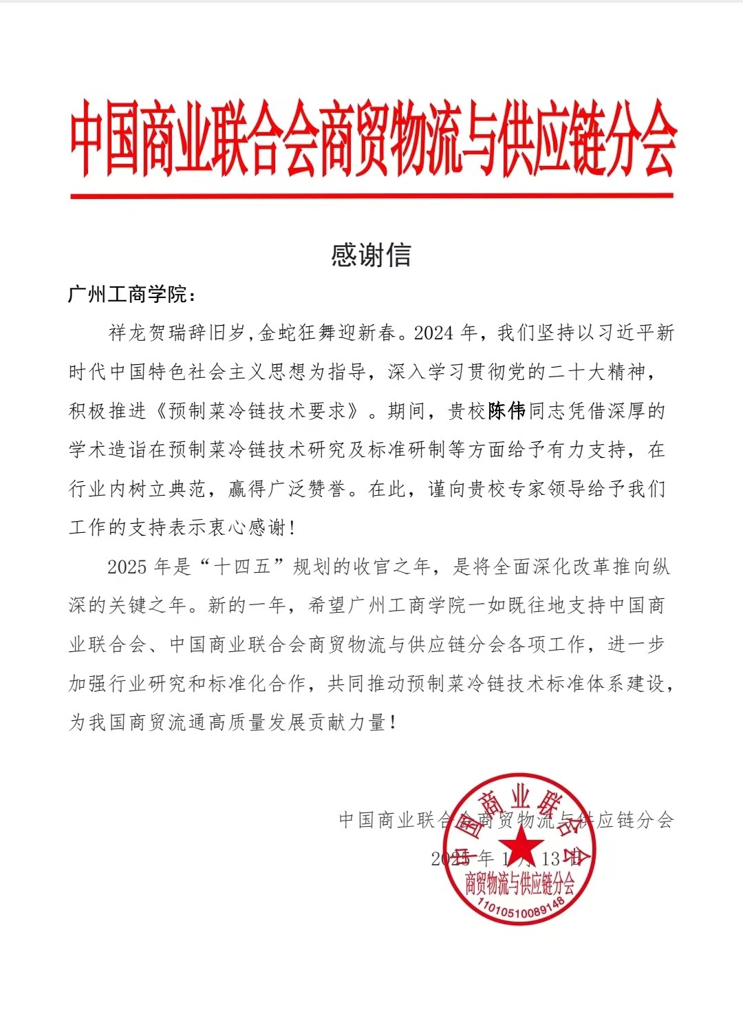 【本网讯】近日,学校收到中国商业联合会商贸物流与供应链分会的感谢信,对管理学院副教授陈伟在《预制菜冷链技术要求》标准体系建设中的突出贡献表示高度认可。这一荣誉不仅是对陈伟个人成就的肯定,更是ky开元在教学科研与服务社会领域成果的彰显。 在推进《预制菜冷链技术要求》标准体系建设进程中,陈伟充分发挥ky开元冷链物流的特色优势,凭借其多年教学科研、学术研究以及服务行业企业的丰富经验,在预制菜冷链技术研究和标准研制方面贡献卓越,在行业内树立了典范,赢得广泛赞誉。