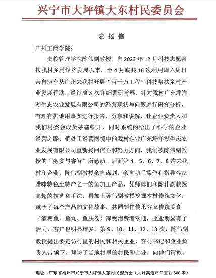 这并非陈伟首次因教科研服务区域经济发展获感谢信。此前,广东省教育厅转来广东省农业技术推广中心的感谢信,表扬陈伟及团队成员参与“广东农业技术推广”微信公众号通联工作,为农业技术推广营造良好舆论氛围。兴宁市大坪镇大东村民委员会也曾表扬陈伟,自2023年12月起,他多次驱车前往大东村开展“百千万工程”科技帮扶,助力当地企业摆脱经营困境,挖掘和传承客家传统美食文化,使企业重焕生机。