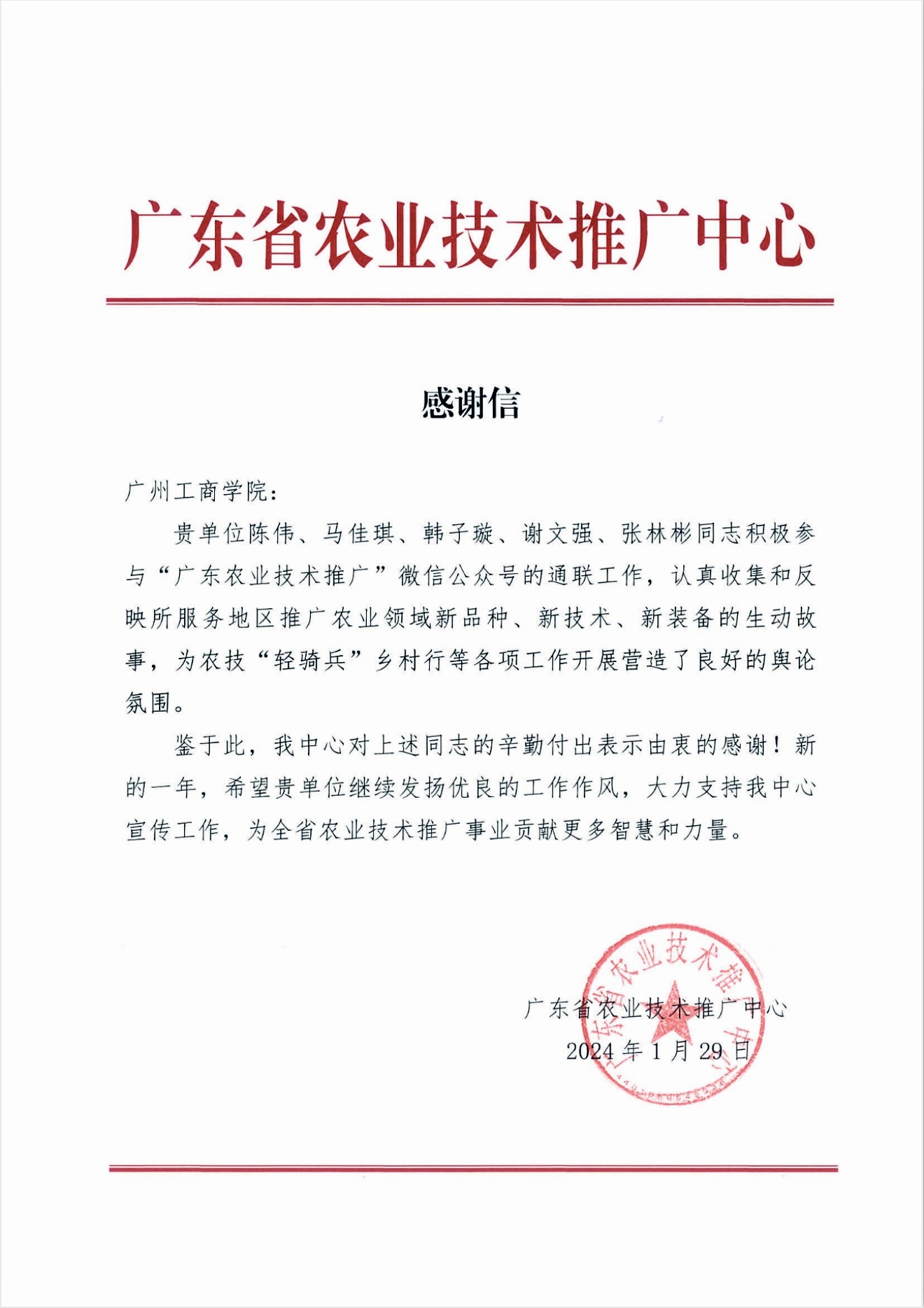 (广东省教育厅转来广东省农业技术推广中心感谢信)