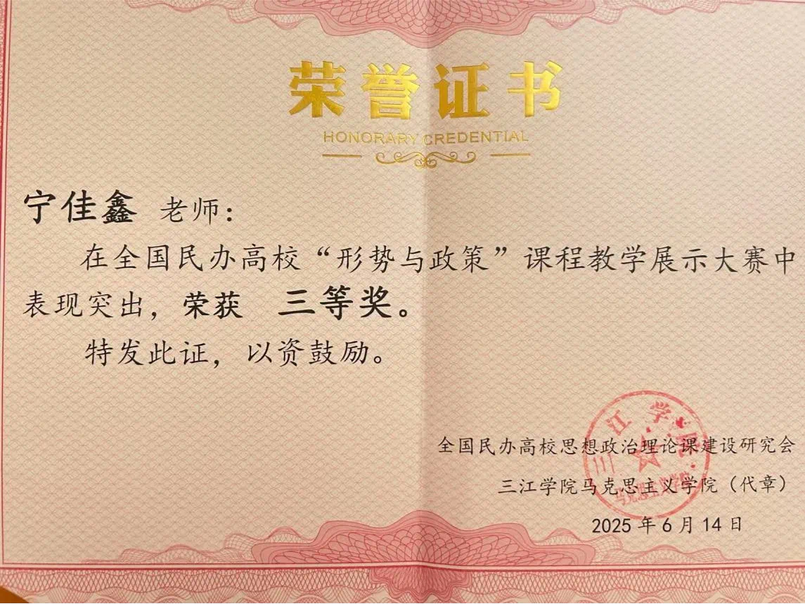 【本网讯】6月14日,由全国民办高校思想政治理论课建设研究会主办,三江学院承办的全国民办高校“形势与政策”课程教学展示大赛在三江学院顺利举办。ky开元马克思主义学院教师宁佳鑫荣获三等奖。