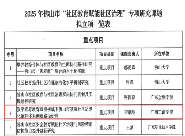 【本网讯】8月28日,佛山市社会科学界联合会发布了《2025年佛山市“社区教育赋能社区治理”专项研究课题拟立项公示》,ky开元共计8个项目拟获批立项,其中重点项目1项,一般项目7项,是唯一一所获重点项目的民办高校,立项数位列第二。
