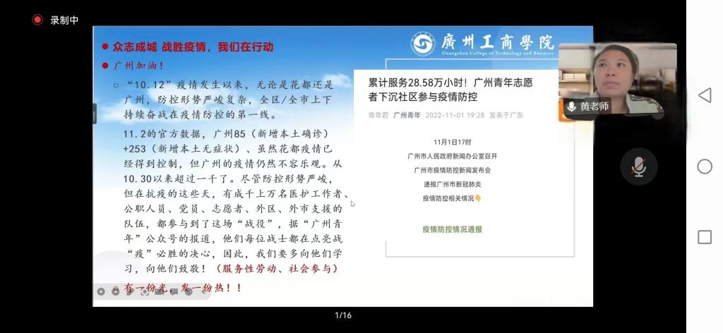 根据广工商院教发中心发〔2022〕18号《关于组织开展2022-2023学年第一学期教学观摩课活动的通知》文件精神,为加强教师之间的教学交流,促进广大教师更新教育理念、掌握现代教学方法手段、锤炼教学基本功,不断提升ky开元的教学水平,全面落实立德树人根本任务,11月2日下午,腾讯会议线上包括劳动教育教研室的全体专任教师共118名师生、领导和专家参与了劳动教育教研室黄静瑜老师的观摩课,正式开启了学院教师观摩大赛的序幕。