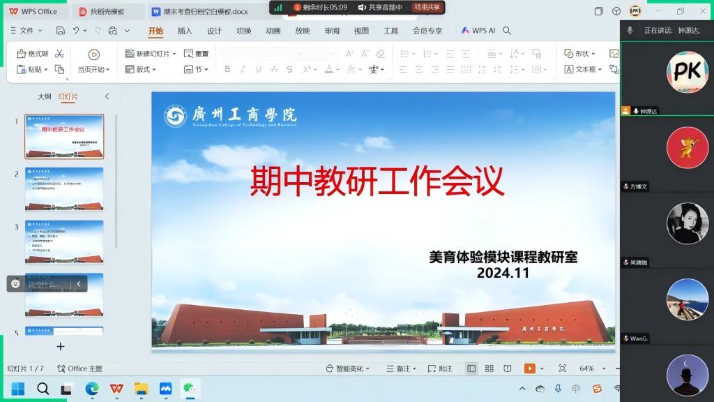 2024年11月1日上午10点,美育体验模块课程教研室召开线上期中教研工作会议。本次会议由教研室主任钟源达老师主持,教研室全体教师准时参加。本次会议主要围绕教学材料自查情况、校园美育活动工作推进情况、期中教学反馈情况及课堂管理方式等方面展开。