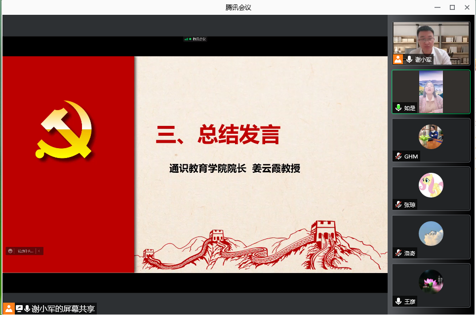 通识教育学院院长姜云霞教授做了总结发言。她强调,十九届六中全会精神内涵十分丰富,我们应该持续在学懂、弄通、做实上下功夫,要内化于心,外化于行,把它转化为推动工作落实的具体实践,奋力开创新时代教育改革的新局面,为建设更好更强的通识教育学院作出我们每一个党员应有的贡献,我们应该把党的建设、党建工作和业务工作有机结合,更好的来推动教育教学、创新发展的育人成效,并对通识教育学院本年度所取得的成绩进行全面且细致的梳理和汇报,对于各位党员老师和支部党员干部的付出和努力给予了高度的肯定,对未来通识教育学院的发展提出了新的要求,并倡导各位党员教师在工作之余抽出时间进行反思,反思自己作为一名党员是否起到了先锋模范带头作用,是否能够成为所任教课程中的骨干教师。强调工作一定要有方向,才会有抓手。她嘱咐各位教师要站好期末的最后一班岗,做好期末考试、监考阅卷等工作,为本年度交上一份完美的答卷。