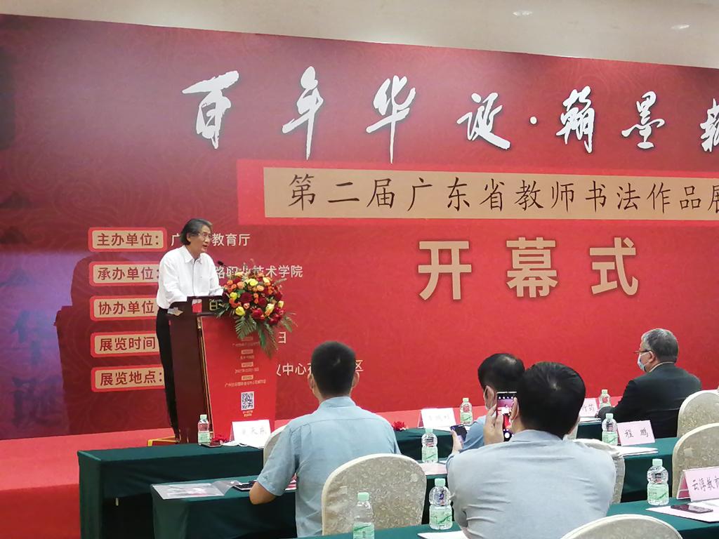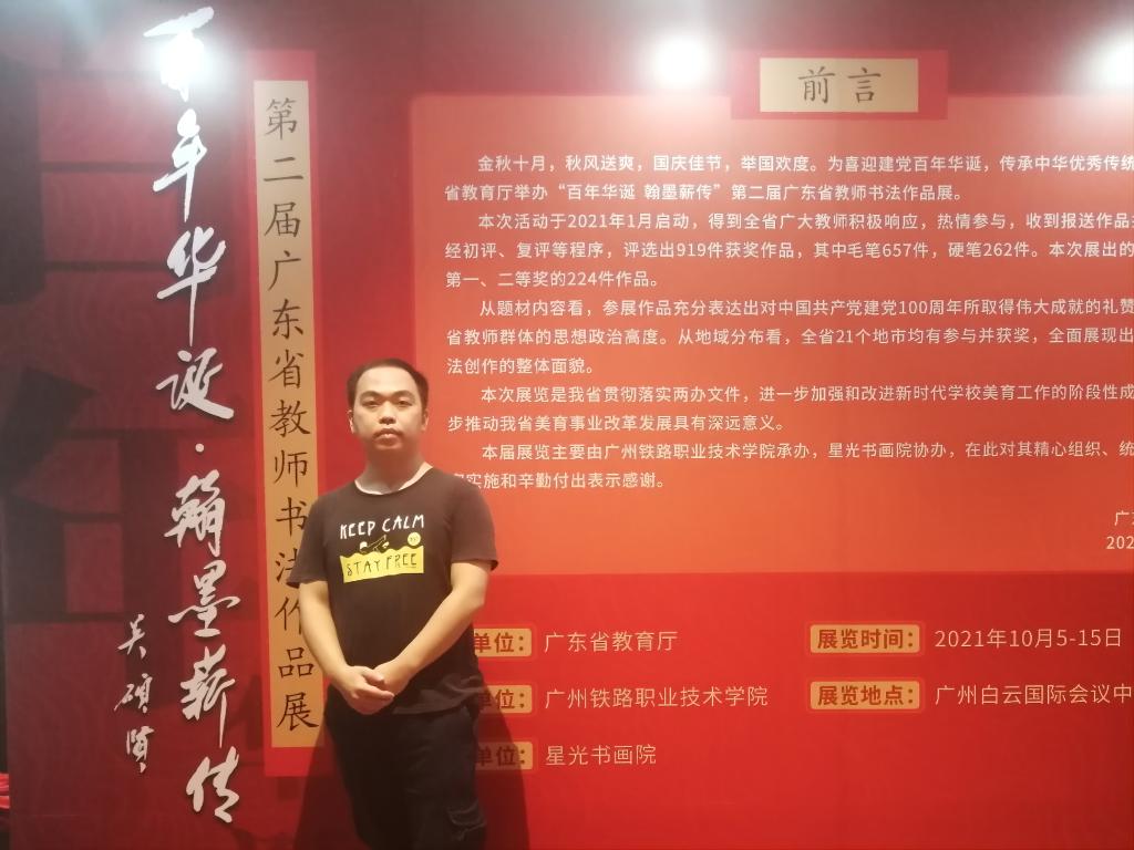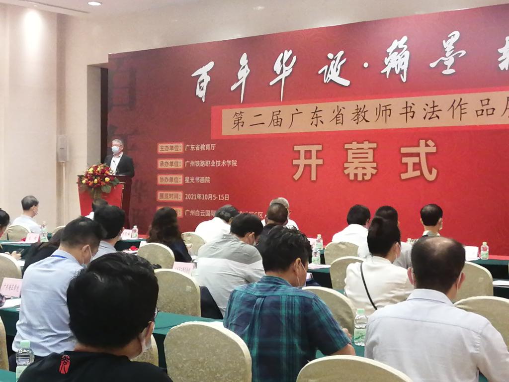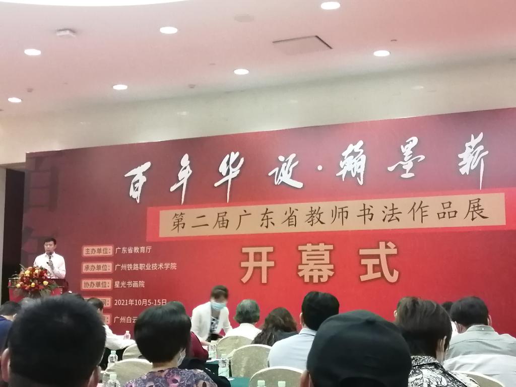2021年10月9日,由广东省教育厅主办、广州铁路职业技术学院承办的“百年华诞 翰墨薪传”第二届广东省教师书法作品展的开幕式在广州白云国际会议中心举行。中国科学院吴硕贤院士亲笔题写“百年华诞 翰墨薪传”展签。中国科学院院士吴硕贤、中国书法家协会秘书长郑晓华、广东省教育厅二级巡视员邱克楠以及广州铁路职业技术学院党委书记张竹筠以及省市书协代表、各地市教育局、高校代表等出席开幕式并观看展览。学院公共艺术课程教研室钟源达老师参加了此次开幕式。