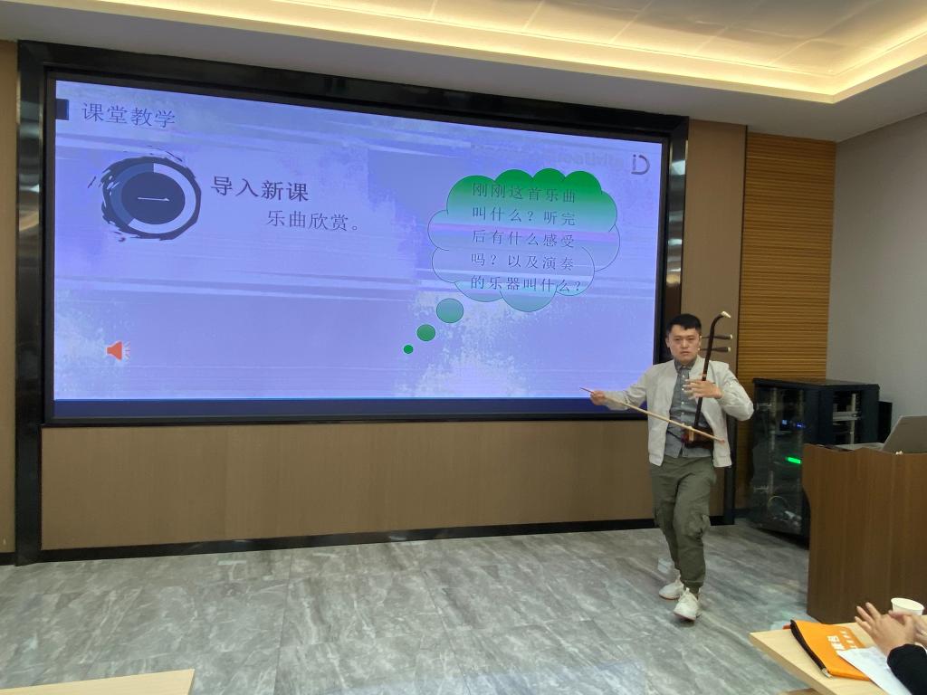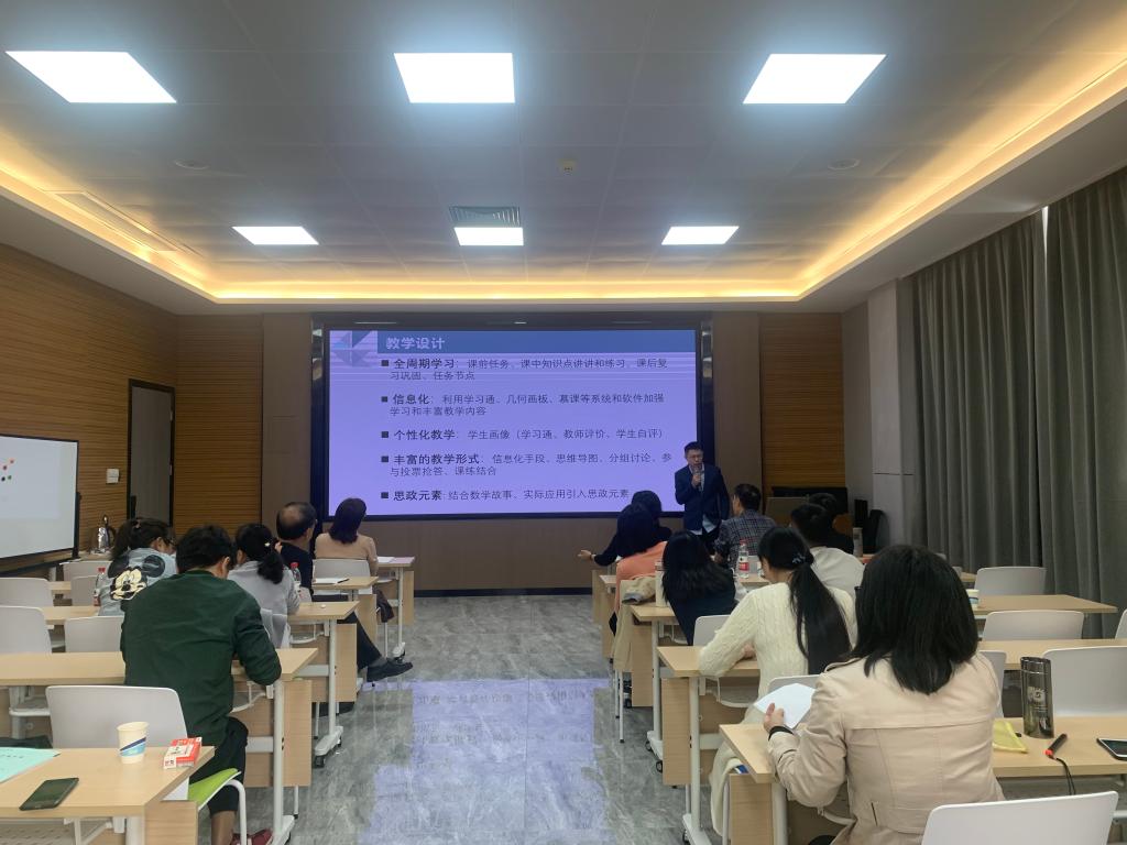 比赛现场,参赛教师聚焦教学实践的真实“问题”,从课程内容的重构、教学方法的创新、教学环境的创设、教学评价的改革等方面,就所任教课程进行了3分钟说课+8分钟课堂教学展示共11分钟的创新教学汇报。参赛教师从课程的教学痛点和难点出发,介绍了信息技术运用方法,思政元素融入方式,梳理总结了课程教学的创新点以及成效,展现了自身良好的创新能力与教学素养。其中,心理健康教育课程骆思贤老师在人际交往艺术专题授课中,以大学生宿舍人际关系为典型案例,积极融入课程思政元素;公共艺术课程龚洪敏老师进行二胡演奏示范教学,融欣赏法、歌唱法、疑问法和讨论法于课堂教学中;线性代数课程魏玉华老师以中国航天事业发展中太空探测器轨道数据问题进行导入,在课程中融入爱国情怀和科技价值;概率论与数理统计课程高敏老师在导数的讲解中引入奥运冠军苏炳添9秒83的记录实例,并积极融入学习通、几何画板、慕课等系统和软件创新教学手段。
