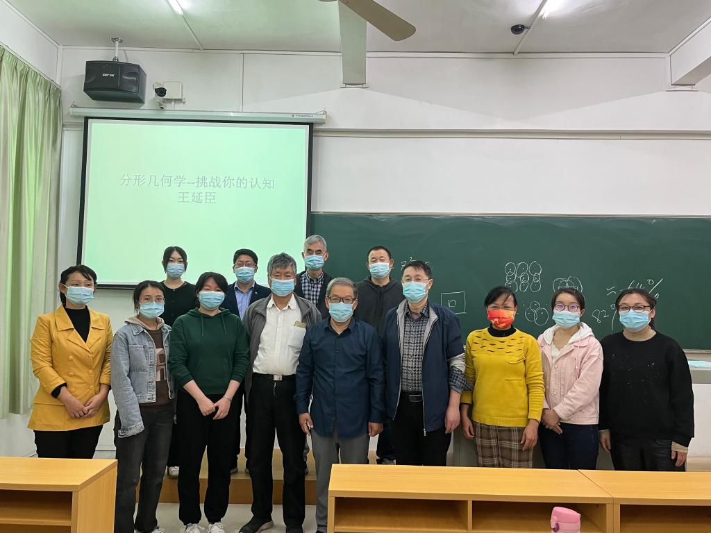 会上,为进一步挖掘课程思政元素,王延臣教授为全体教师作“生活中的数学,分形几何学——挑战你的认识”专题讲座。王教授提出,任课教师首先要善于观察,留心日常生活中的数学课程思政元素。王教授从节水灌溉系统的数学模型谈起,再到东北名菜地三鲜中土豆要“锛”的制作,引出”分形几何学“。分形几何学是一门以不规则几何形态为研究对象的几何学,相较于传统几何学的研究对象为整数维,它的研究对象为非负实数维数,如科赫曲线、鲁宾斯基地毯等,这就打破了人们的感官认识,实际上它们的维数比2维小,却比1维大。分形几何学的研究对象普遍存在于自然界中,是”大自然的几何学“,在艺术作品的设计中、医学、地质勘探、地震学和技术分析中都有广泛应用。