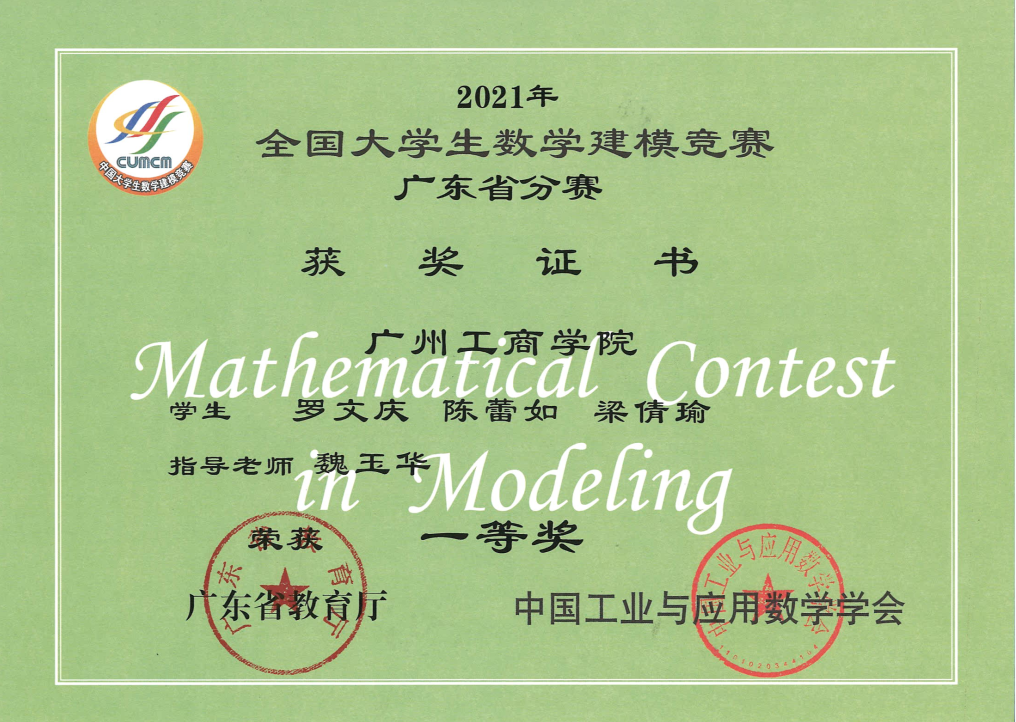 近年来数学类课程教研室、大学语文课程教研室积极指导学生参加省级及以上各类学科竞赛,共获一等奖19项,二等奖34项,三等奖54项,优胜奖若干项。2021年,获全国大学生数学建模竞赛广东省分赛一等奖1项、三等奖2项、优秀奖6项,获第五届中青杯全国大学生数学建模竞赛二等奖4项、三等奖1项、优胜奖2项,获第十一届广东省大学生数学竞赛三等奖13项。