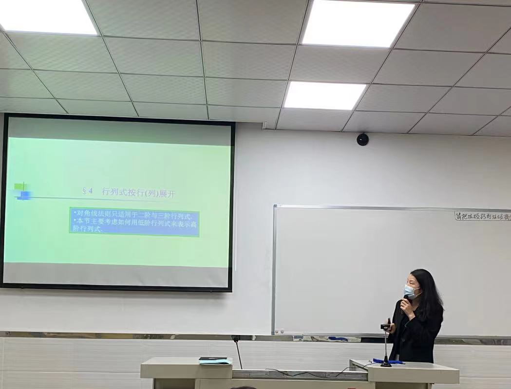 大赛开始,第一位参赛教师褚青涛老师通过以隐藏在稀疏矩阵中的情诗引入余子式,继而给出余子式和行列式展开的定义,并结合例题,详细列出解题步骤,讲授清晰易懂,应用性强。