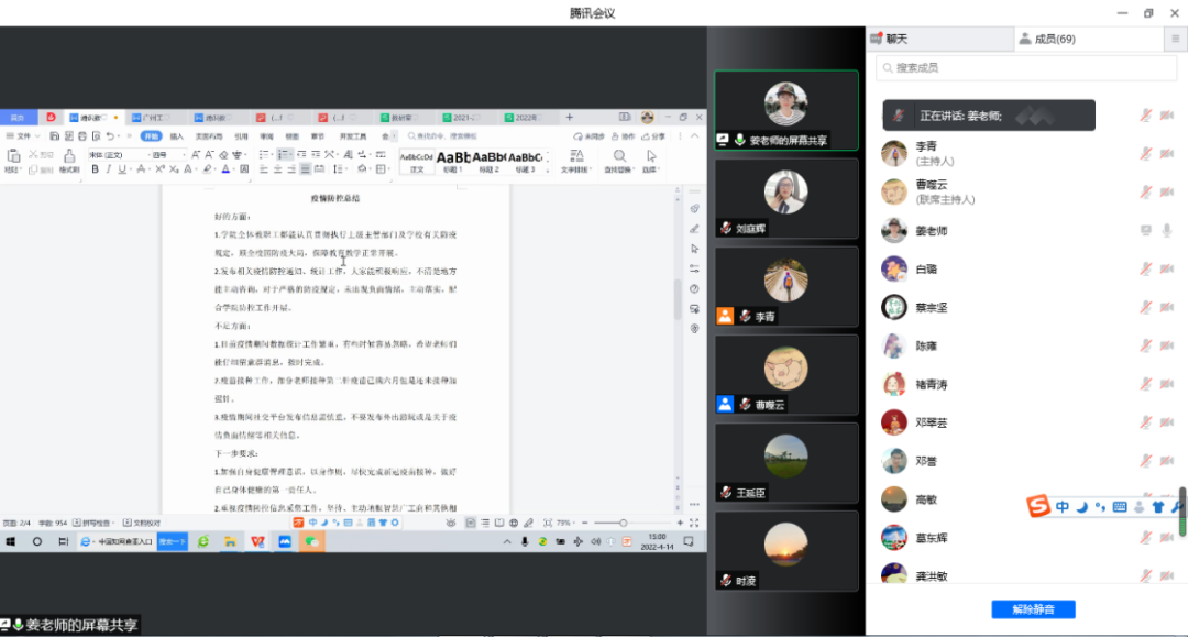 最后,姜院长针对下一步工作进行了安排:一是要求全体教职工严格遵守学校防疫规定;二是做好日常教学及重修课程教学组织实施工作;三是对本学期工作量进行精准核算;四是按要求做好职称晋升准备工作;五是抓好数学建模培训工作。