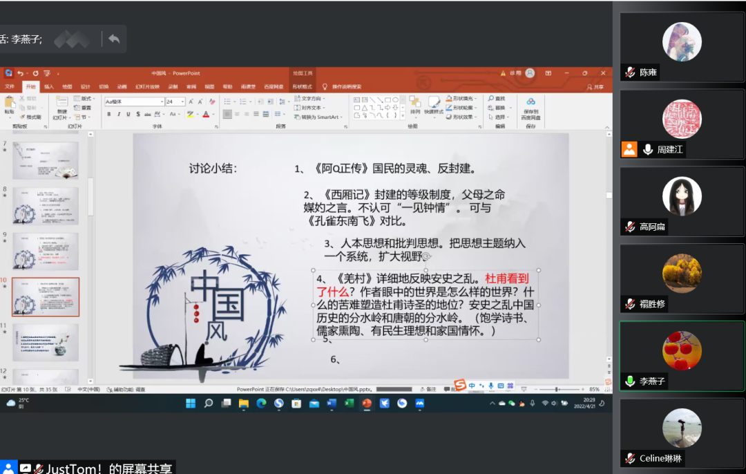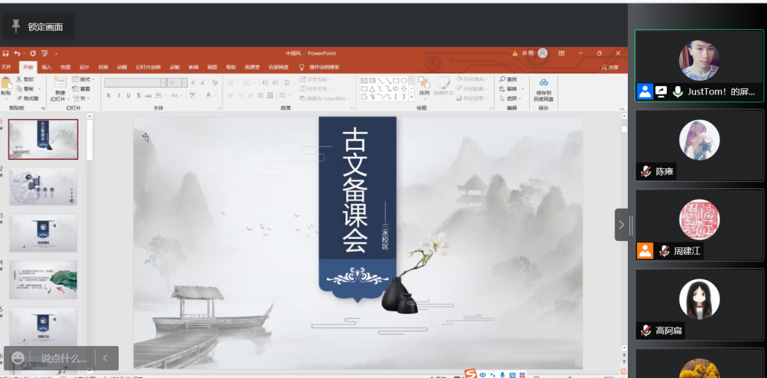 为集思广益凝聚集体智慧,推动大学语文课程教学改革,全面提升教学质量,4月22日,大学语文课程教研室三水校区备课组召开线上集体备课会。三水校区本学期承担大学语文课程教学任务的全体教师参会。会议由备课组组长徐翔老师主持。