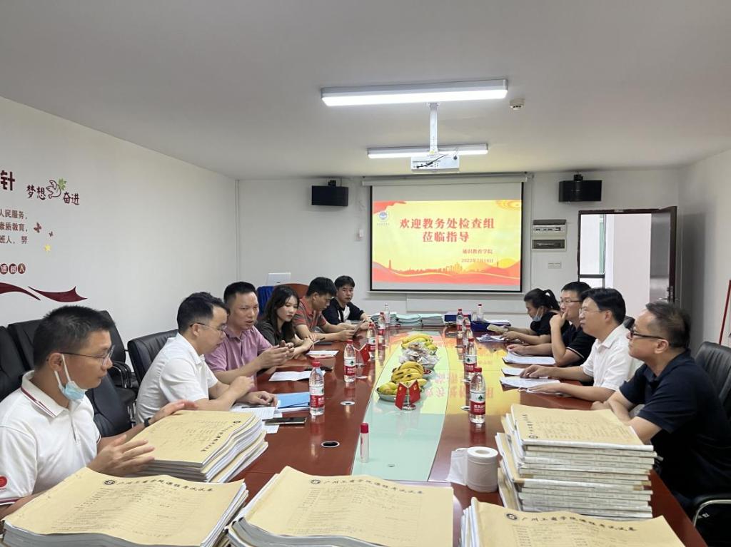 7月18日下午,教师发展中心主任、教务处副处长曹远明与教务处处长助理黄仁刚等6人一行莅临通识教育学院开展教学运行档案专项检查工作。校长助理、通识教育学院院长黄鹏,院长助理谢小军,办公室主任李青,劳动教育教研室主任刘强,心理健康教育课程教研室主任邓翠芸、军事教研室蔡宗坚老师等8人参加,检查地点为三水校区院部楼524会议室。
