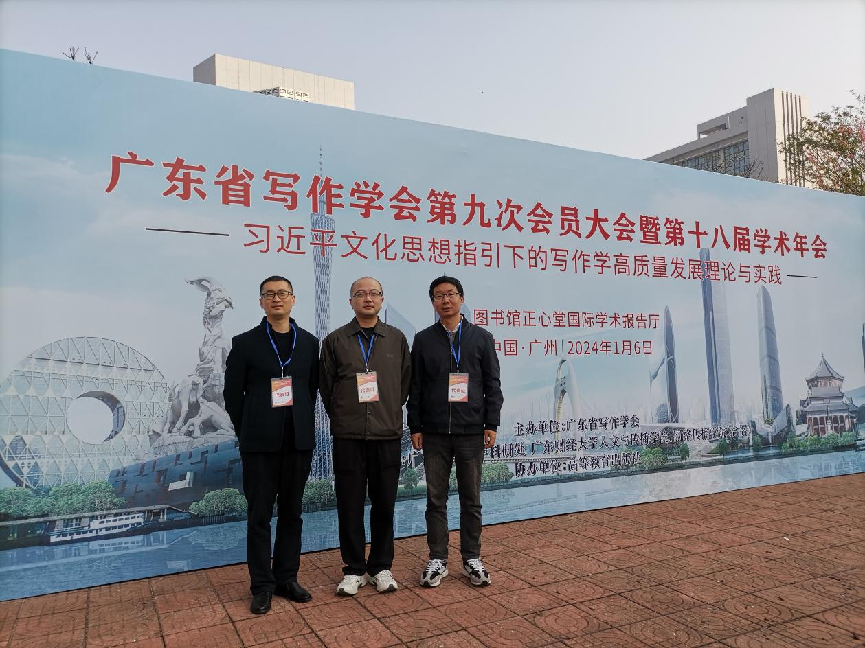 2024年1月6日,广东省写作学会第九次会员大会暨第十八届学术年会在广东财经大学广州校区成功举办。会议以“习近平文化思想指引下的写作学高质量发展理论与实践”为主题,旨在为广东省写作理论研究者和实践者搭建起对话平台,为推动新时代写作学高质量发展贡献智慧力量。省写作学会会员及省内50多所高校和社会团体的专家学者,行业企业、新闻媒体代表200余人参加会议。我院中华文化模块教研室邱代东、赵万彬、葛东辉三位老师参加了此次会议。