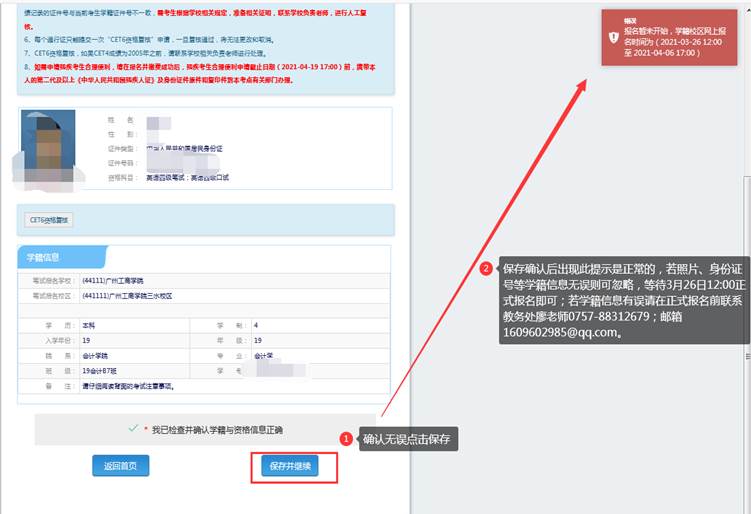考生即日起可登录报名系统核对个人信息和报考资格,如个人信息有误须在报名前联系教务处进行修改后再上网报名。考生完成报名后,个人信息不得修改。