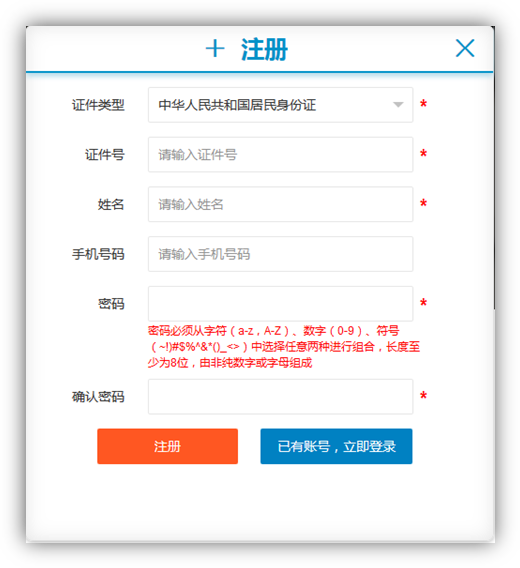 点击“注册”按钮,完成个人用户注册;注册时必须如实填写个人证件号、姓名及手机号,注册过程将自动校验个人学籍信息,填写不正确将无法成功注册。