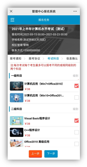 选择报考科目时,注意计算机考试科目只能选择不同级别的任意两门进行考试;选择完成后,点击“下一步”;