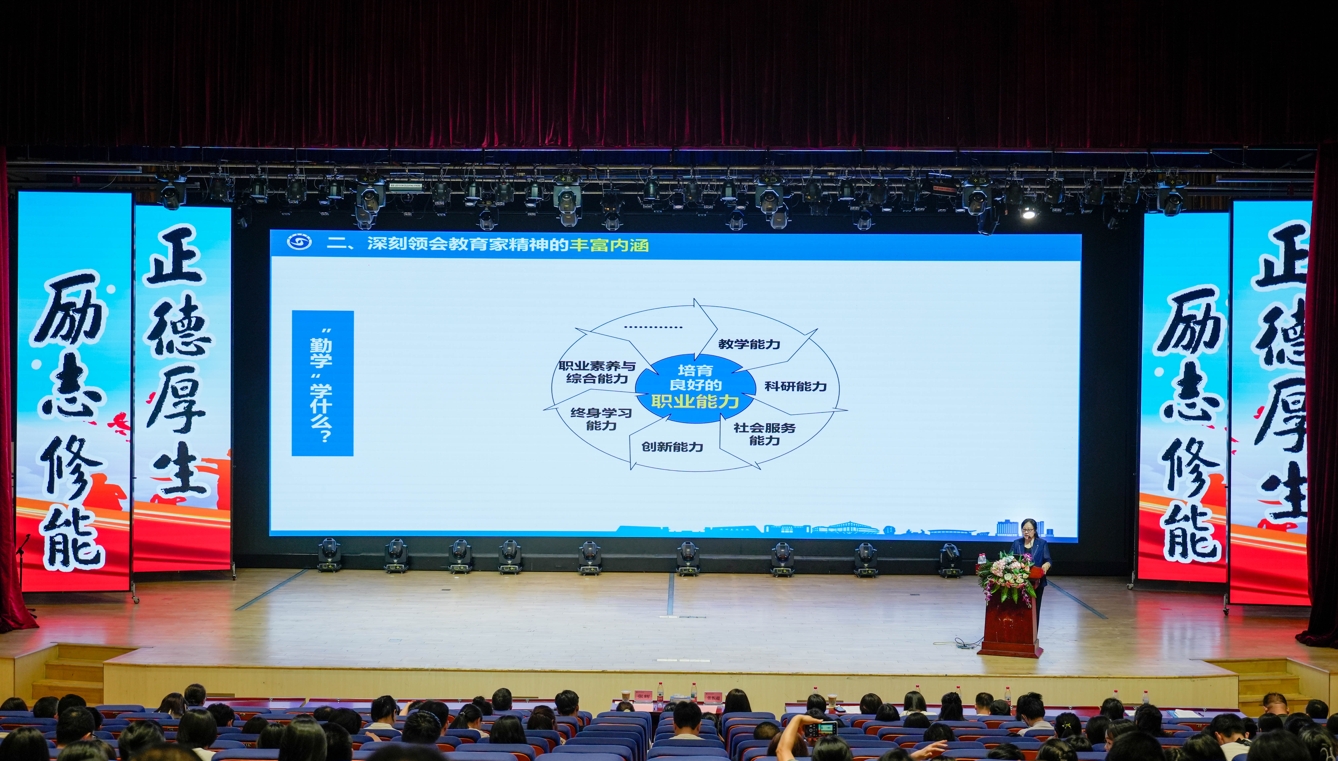 张辉作题为“弘扬教育家精神,强化师德师风建设”的报告。报告从“为什么”“是什么”“怎么做”三个维度展开,首先深入分析了弘扬教育家精神的时代价值,指出这是建设教育强国、打造高素质专业化教师队伍的必然要求;其次,系统分析了教育家精神的丰富内涵,展示了教育部曝光的违反教师职业行为十项准则典型案例,教育大家要引以为戒、守住师德底线;最后,结合学校实际,提出“四个方面”的实践路径:在自我完善中涵养师德,在健康心态中培育师德,在实践磨炼中彰显师德,在团队建设中传承师德。张辉教授以“向教育家学习,育人先育己,修身我先行”的箴言作结,引发强烈共鸣。