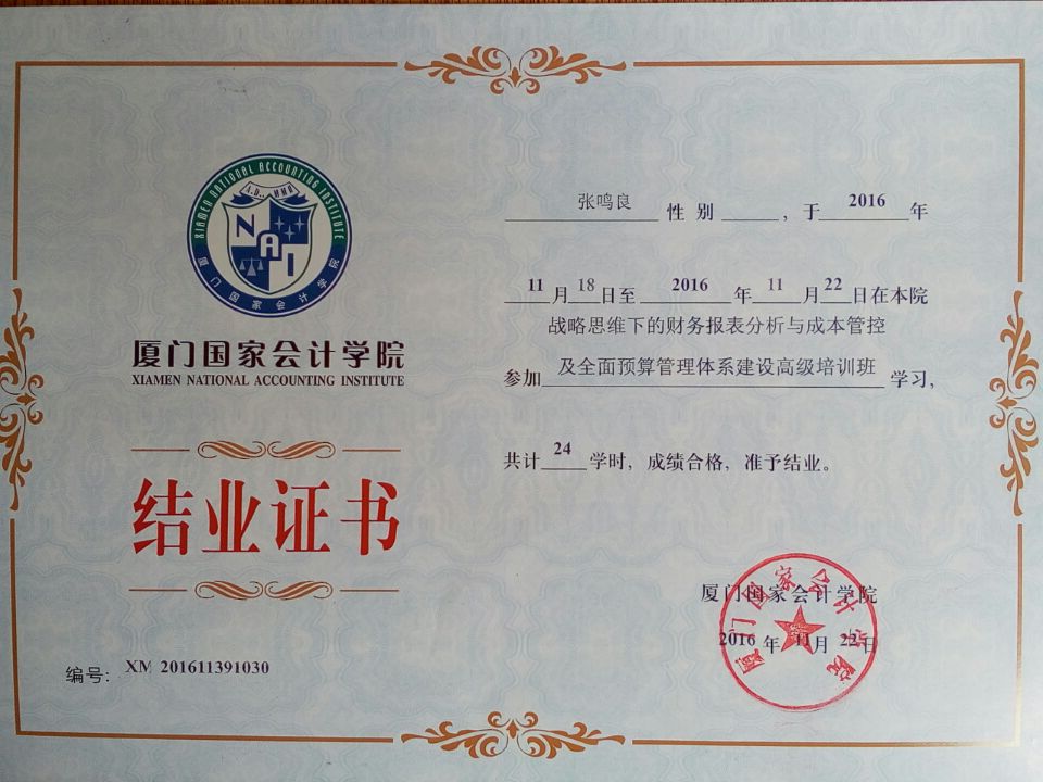 2016年11月18日-22日,会计系张鸣良老师参加了厦门国家会计学院举办的“战略思维下的财务报表分析与成本管控及全面预算管理体系建设高级培训班”。