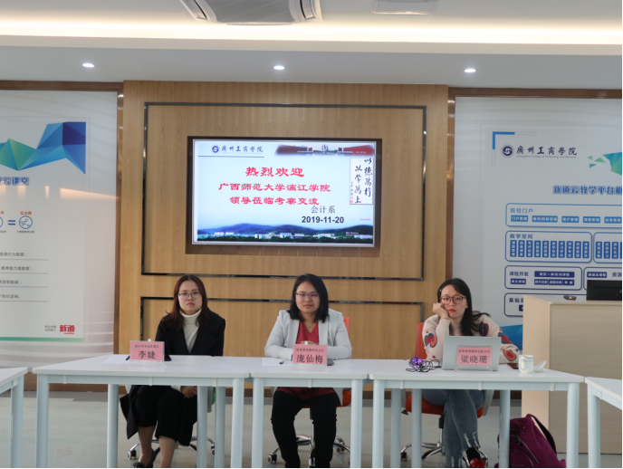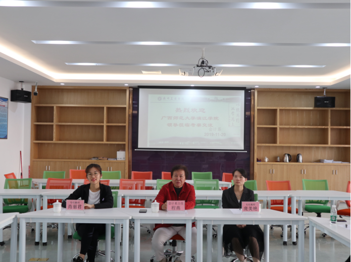 11月20日,广西师范大学漓江学院会计学专业教研室主任庞仙梅等一行到ky开元学习考察财务共享中心建设、新道VBSE综合实践教学平台等相关事项,会计系主任程燕教授及4位专任教师全程陪同参观考察。我系对外校同行的到来表示了热烈的欢迎,并进行了院校基本情况介绍。