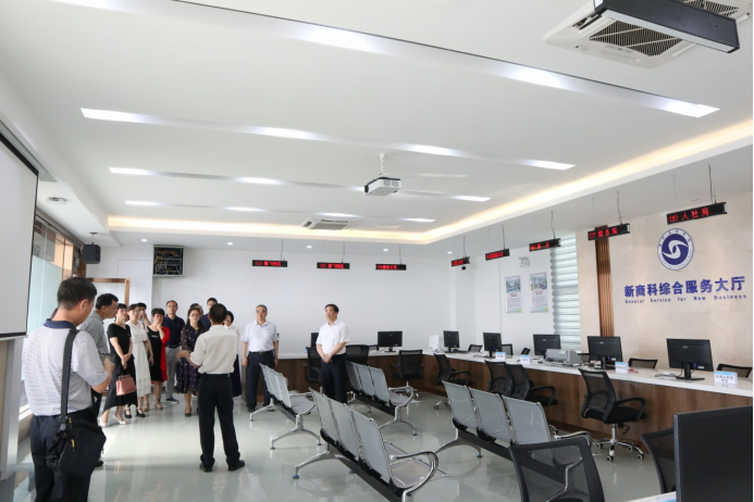 然后,来访嘉宾参观了新商科服务大厅,对全仿真的模拟环境赞叹不已。新商科服务大厅主要由四个部分组成:虚拟商业社会环境VBSE政务服务中心、税务局、银行、服务公司。