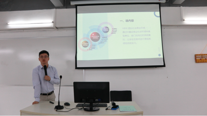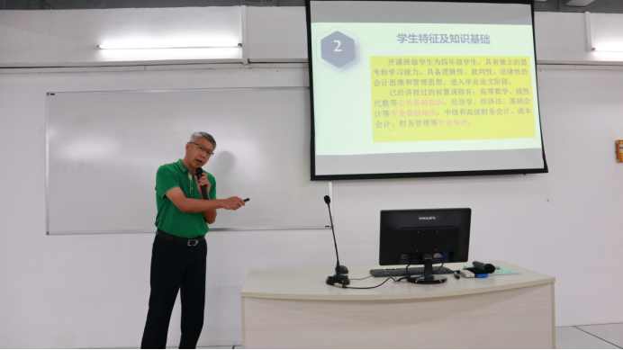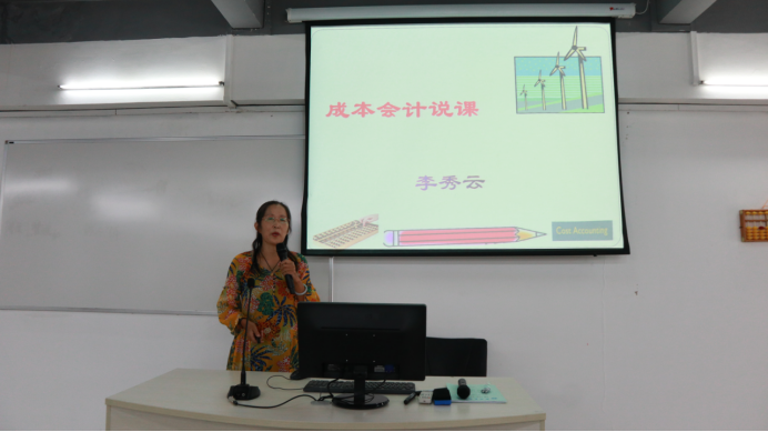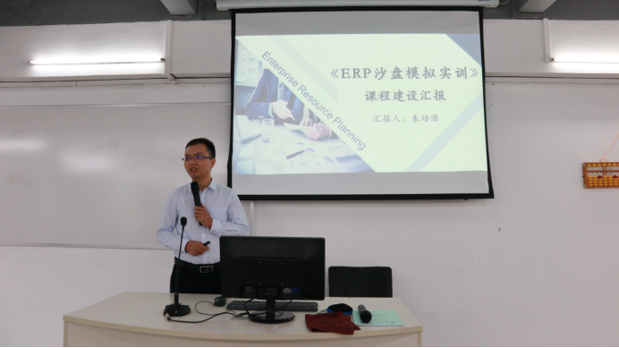说课程建设由会计学教研室副主任黄璐老师和首席教师朱培源老师分别对《会计技能实训》和《ERP沙盘模拟实训》进行汇报。两位老师对课程设置、课程定位、课程团队建设、教学改革、教学方法的创新、存在的问题及对策等方面做出了详细的汇报。