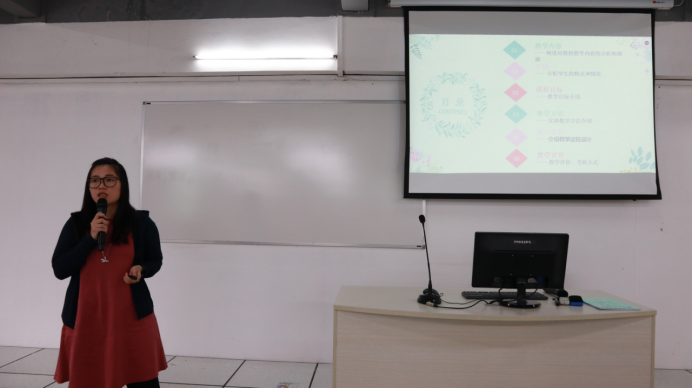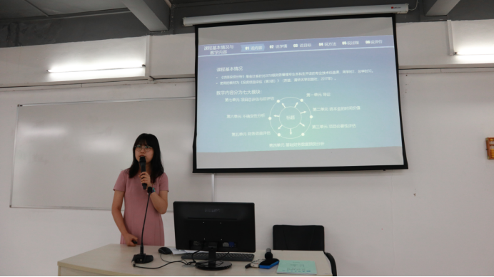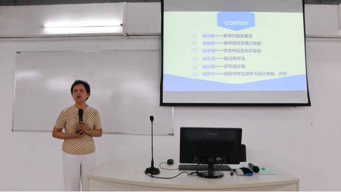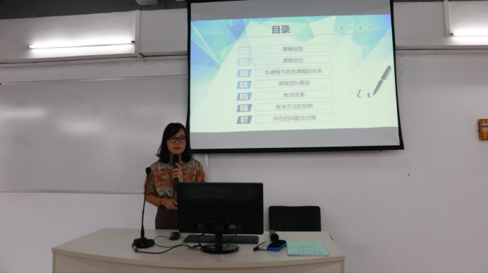 说课程教学由李凌秋、李秀云、范春杰、聂秀萍、邓晔莹、徐晨歌、谭敏夫这七位老师进行汇报。七位老师阐述对教材教学内容的分析和理解,分析学生的特点和情况,介绍教学目标、教学方法、教学过程设计、教学评价、考核方式。
