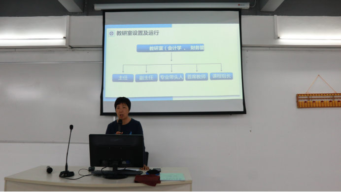 会计系高玉莲副主任从会计系的教学管理机构、教研室、教师素质、教学质量、学风建设、问题与措施这六个方面进行汇报。高主任表示会计系将开展课堂思政主题活动,利用公开课、示范课等形式,以课程思政为切入点,将立德树人内化到课程教学各方面、各环节,有机融入社会责任、职业操守、道德规范、法治意识等德育元素,坚持价值引领贯穿教学全过程。