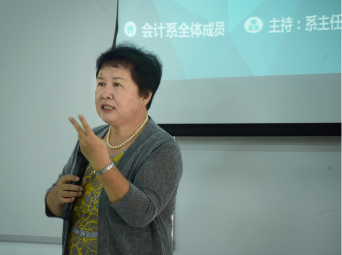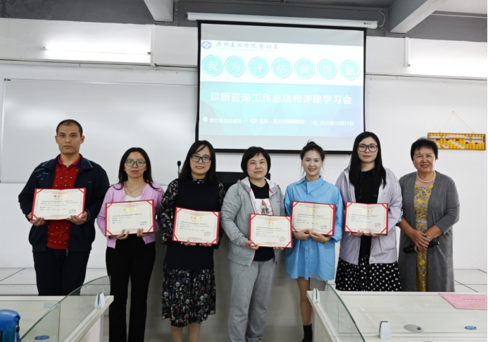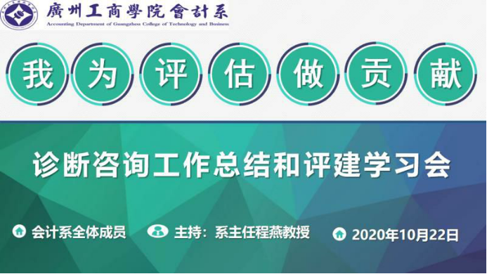 10月22日星期四下午会计系在第二实验楼C404召开全体教职工会议,进行诊断咨询工作总结和评建学习、评建动员活动,主题为:我为合格评估做贡献,主讲人:系主任程燕教授。