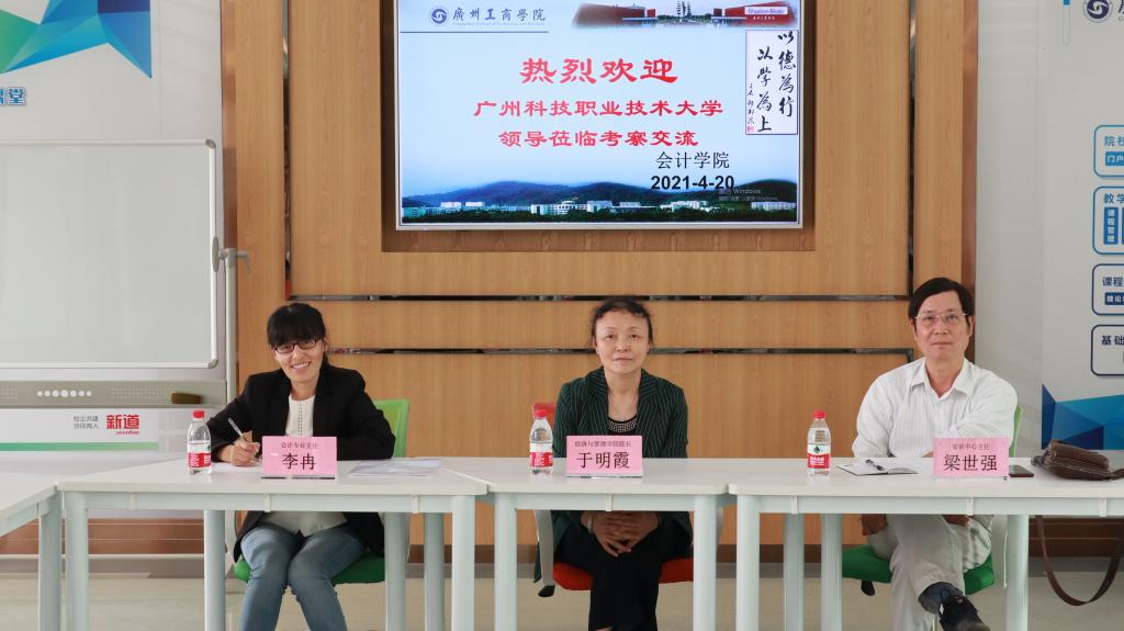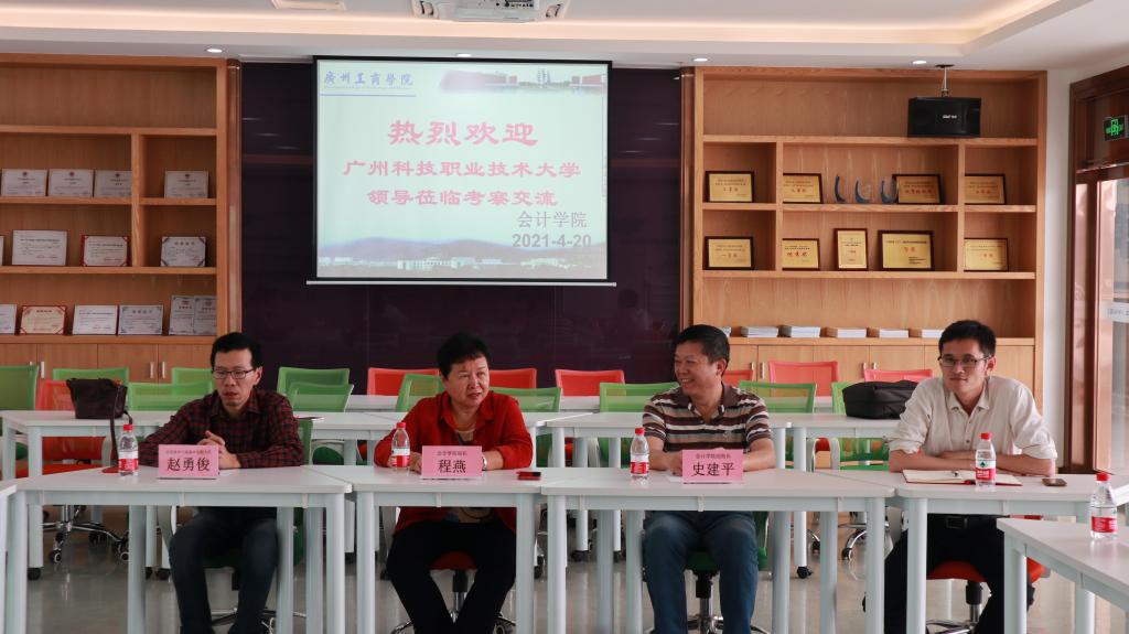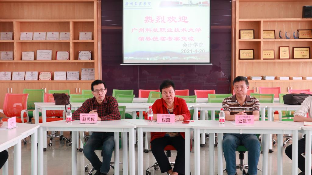 2021年4月20日下午,广州科技职业技术大学经济与管理学院院长于明霞教授等一行五人到我院考察交流。我院院长程燕教授和信息技术与装备中心赵勇俊副主任等在第二实验楼E602智慧课室接待了于明霞教授一行。