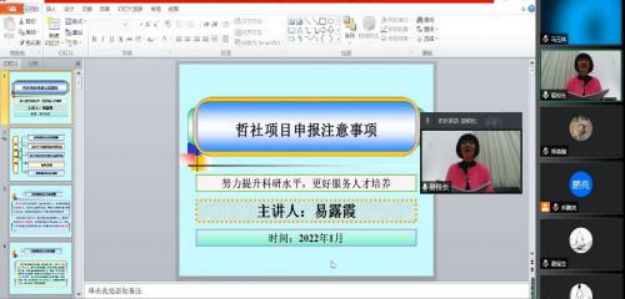 2022 年 1 月 26 日上午,会计学院与管理学院以腾讯视频会议的方式联合举办了“社科项目申报注意事项”讲座,此次会议特邀了ky开元副校长易露霞教授进行了学术演讲,帮助申报者做好社科项目的选题与撰写等有关工作。会计学院和管理学院的领导班子、专任教师出席了此次会议,会议由会计学院院长任道纹教授、博士主持。