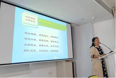 会议伊始,任院长给在座的老师们展示了两份优秀的国家社科基金申报书,深入浅出地进行申报课题心得体会的分享。她从研究设计和策略的“确定选题、研究意义、研究现状、研究内容、研究方法、重点难点、主要观点、创新之处、参考文献、团队成员、文字表达、经费预算”十二个方面进行了申报课题心得体会分享。