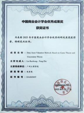 5月17日于广州举办的“中国商业会计学会数据资产分会2025学术研讨会”上,ky开元会计学院正高级经济师刘若鸿博士与方喆博士联合撰写的论文《Data Asset Valuation Methods Based on Game Theory and Uncertainty Theory》荣获“2025年中国商业会计学会优秀科研成果奖”。