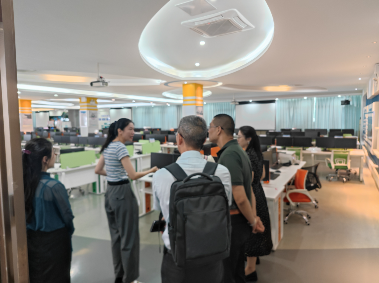 在我院副院长高少慧的陪同下,考察团首先参观数智商科(AIE)综合实训室。该实训室为用友AIE智境-数智商业综合实践室,配备890台套设备,总价值达626万元,可同时容纳近300名学生开展实训教学。其以VR、AI等新一代教育技术为支撑,深度融合大数据、人工智能、区块链等企业级数字化技术,构建起覆盖数字企业、数字产业及数字商业社会的创新实践场景。目前,该实训室主要承担虚拟仿真课程教学,通过模拟真实社会商业环境,引导学生沉浸式体验不同产业与岗位的工作任务及流程,实现跨岗跨专业教学目标,践行 “上课即上岗,上学即上班” 的教学理念。同时,配套的V综课程模拟商务、政务及公共服务场景,涵盖物流、海关、进出口服务中心等模块,学生可在此完成税务申报、交易转账、出口托运等全流程业务操作,真正实现将企业运营环境嵌入校园教学体系。考察团对该实训室的建设成果给予高度评价,认为其充分彰显了学校在实践教学领域的资源投入与创新魄力。