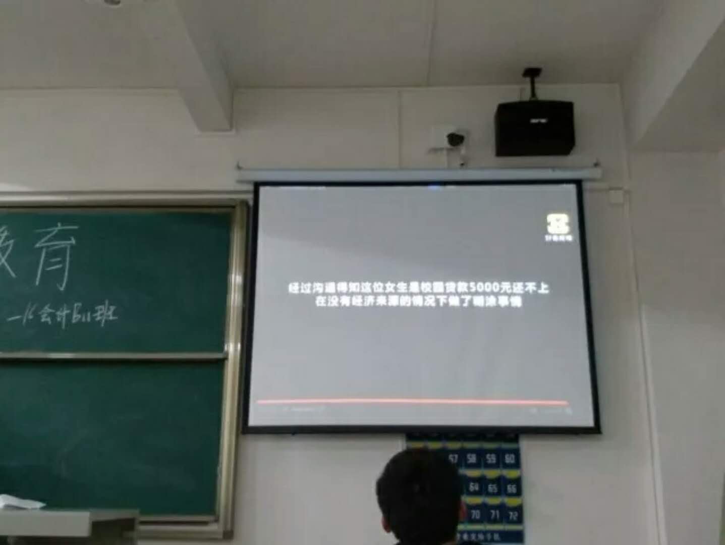 在班会上,首先播放了一个视频,视频中主要讲述一名大学生因价值观发生偏移而险些酿成大错,后为人所教育的事件,其中包括申请校园贷等问题。通过视频,告诉同学要自尊自爱,不要因为一时利益而丢失自己的美好未来。对此还引申了我国在这方面的一些法律。