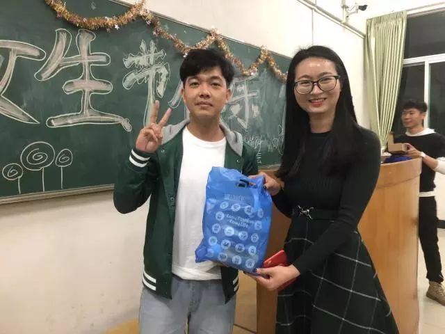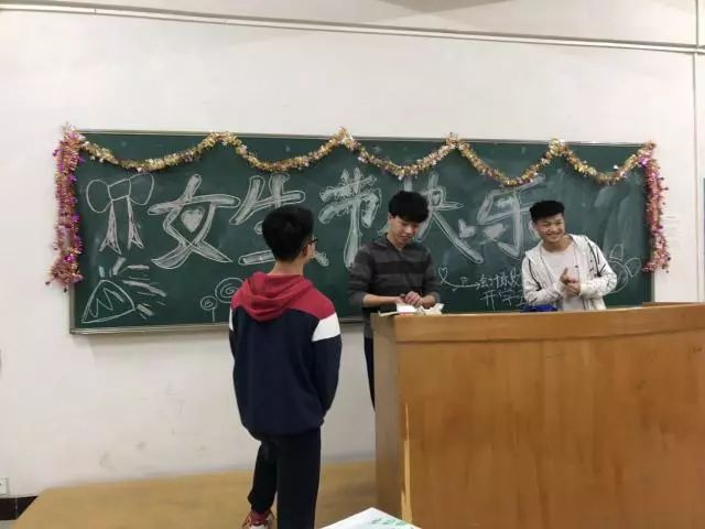 7点整班会开始,男生们就先祝所有女生女生节快乐,然后男生们就把他们准备已久的礼物拿出来,并开始互换礼物!