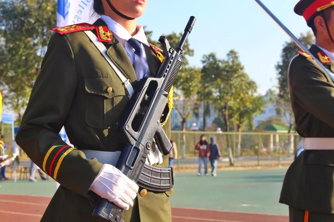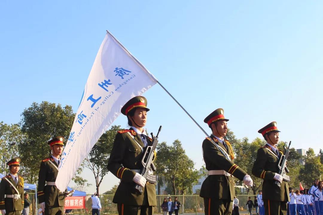 国旗护卫队以挺拔的身姿、铿锵的步伐走来,庄严且肃穆,彰显着广工商开拓创新、勇往前进的精神风貌。