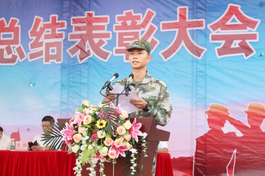 颁奖结束后,军训新生代表邓志豪进行发言。邓志豪同学首先代表全体新生对教官、学院各领导和老师表示衷心的感谢。邓志豪同学就此次军训的历程,为今后的大学生活向同学们提出自己的建议:牢记军训中的点滴,在今后的学习生活中仍然保持着吃苦耐劳、高度自律的态度,积极践行五进,做一名德学兼备,全面发展的合格大学生。