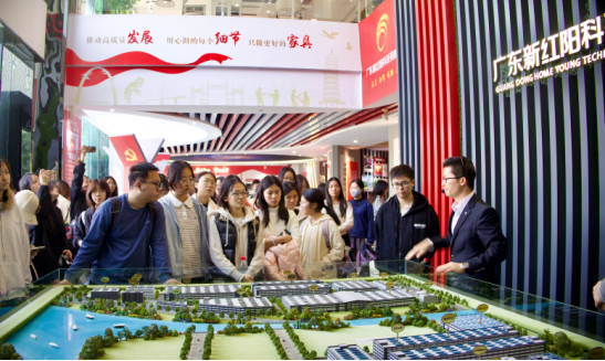 在企业的文化展厅中,广东新红阳家居科技有限公司运营总监兼财务总监陈国荣先生为同学们进行企业文化展厅的深入讲解,同学们首先聆听了关于二十大报告精神的解读,深入理解中国企业在新时代背景下的发展路径与使命担当。随后,通过南岳风采与企业历程展区,大家共同回顾了新红阳从初创到壮大的奋斗历程,感受一家制造业企业在时代浪潮中的坚守与创新。