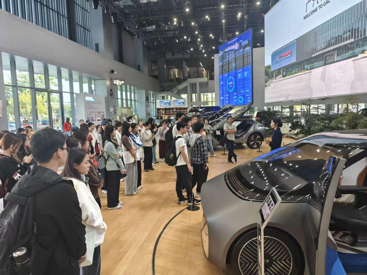 当天下午,同学们首先抵达位于广州南沙的广汽科技展览馆。在销售部工作人员的引导下,大家依次参观了产品展示中心、材料专栏及智能网联技术展示区(涵盖MARVEL系列、GAMES交互平台及SERVICES服务体系)。展区内陈列的“专业选定的八大面板”及品牌设计实物,生动展现了广汽在材料创新、造型设计与用户体验方面的最新成果。同学们通过现场操作与讲解,深入了解了品牌标识系统与优质服务标准的落地实践,切身感受到科技赋能汽车产业的真实场景。