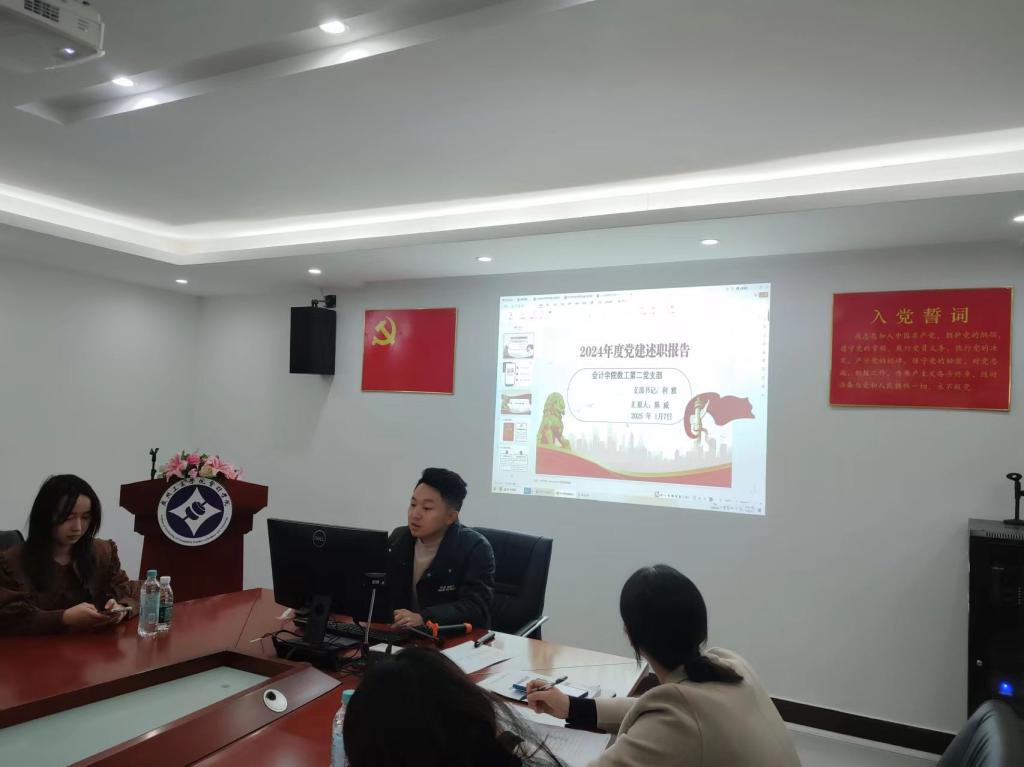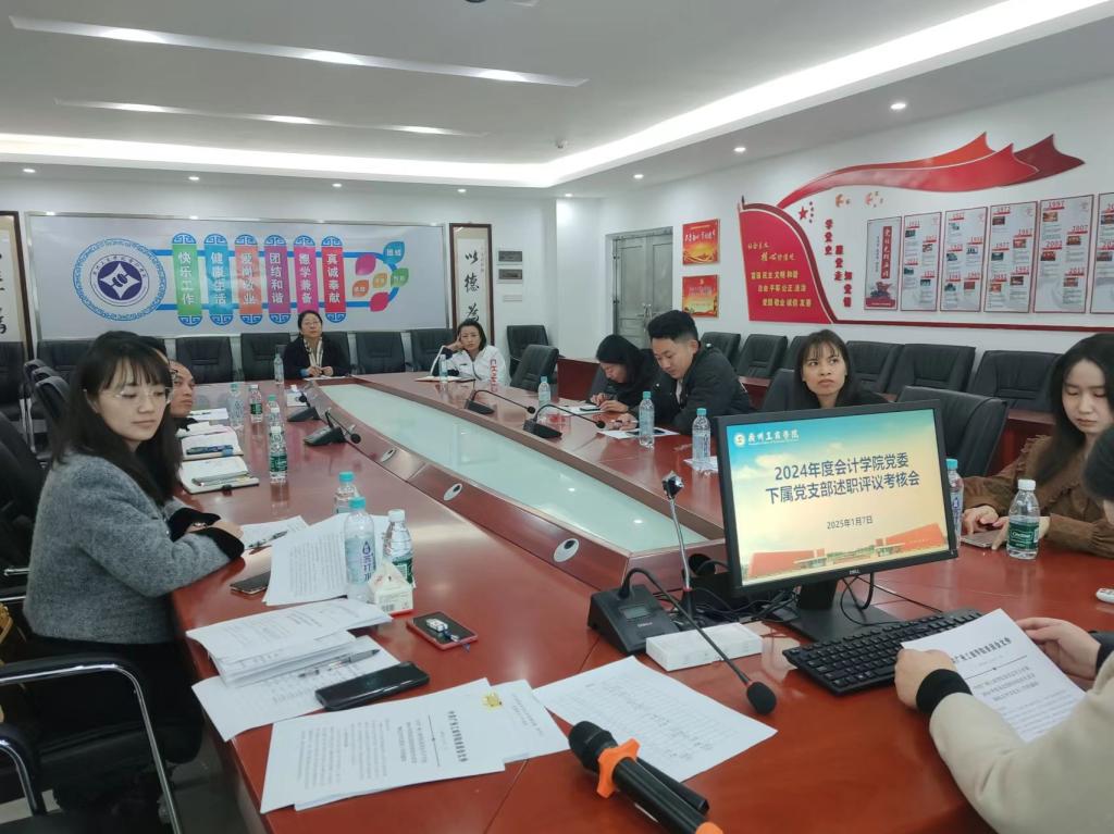 【本网讯】为深入学习贯彻党的二十大精神和党的二十届三中全会精神,进一步夯实基层党组织建设,提升基层党建工作质量,推动全面从严治党向基层延伸,1月7日下午,会计学院党委在院部楼311召开2024年度党支部书记述职报告会。教工和学生8个党支部主要负责同志就本支部年度工作开展情况进行总结,提出下一年工作计划。学院党委成员、支部书记参会,会议由党委组织委员王萌主持