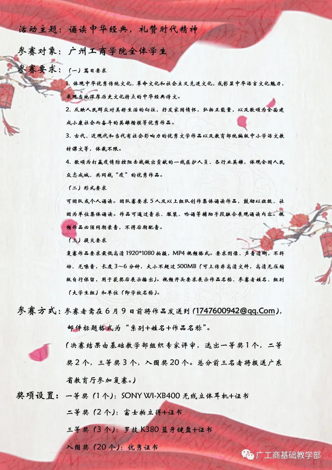 诵读中华经典,让优秀的民族精神在我们的血脉中流淌;诵读中华经典,让民族智慧成为支撑我们人格的脊梁。在薪火相传的国学宝库里,我们相信经典文字是有力量的,它会赐予我们坚实的翅膀,让我们在未来飞得更高、飞得更远。同时,愿我们广工商学子,能够在本次比赛中大放异彩,谱写新的乐章!