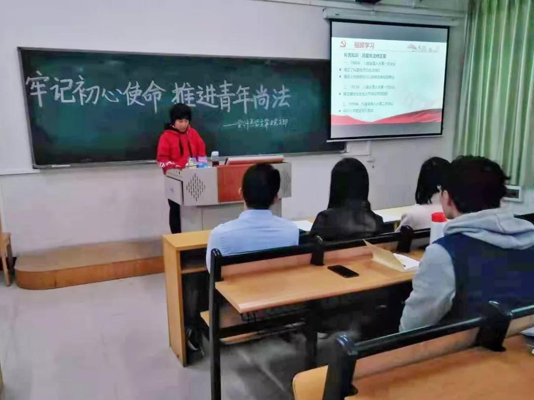 12月19日下午,会计系学生第五党支部在第二教学楼A202课室开展“牢记初心使命,推进青年尚法”主题教育活动,本次活动应到党员同志21人,实到党员同志20人,发展对象作为列席人员5人参与本次活动,活动由学生党员丁文婷同志主持。