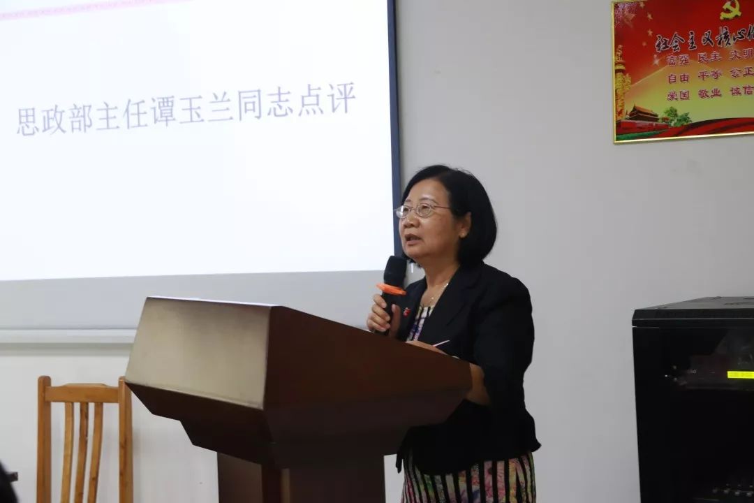 一场精彩绝伦的比赛后,思政部主任谭玉兰同志对各同志的微党课进行点评。谭主任首先高度肯定了七位党员教师的授课形式与内容。其次,她中肯地指出其中存在的不足,虽然有些参赛选手题目问题没有完善,对更新的理论知识没有及时地融合到党课里去。她鼓励广大师生党员们坚持党性修养,与时俱进,做新时代的优秀党员。