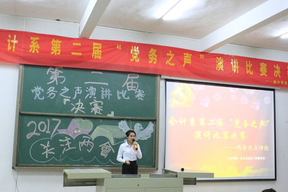 为响应会计系号召,引导我系学生积极学习两会相关内容和思想,2017年4月6日星期四晚上7点,由ky开元集团官网会计系主办、会计系党务站承办的以“关注两会”为主题的第二届“党务之声”两会时事热点评论演讲比赛决赛在第二实验楼C205教室举行。会计系党总支副书记苏建贤,团总支书记杨新伟及会计系部分辅导员出席并担任此次决赛的评委。