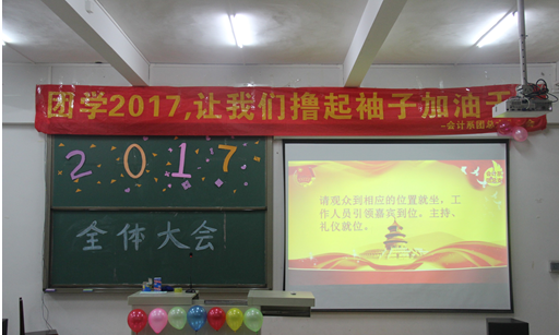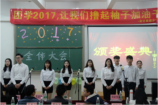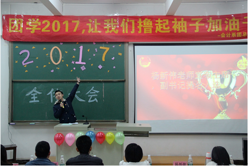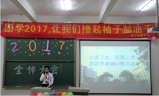紧接着,由杨新伟老师宣布会计系团总支学生会主席及团总支副书记人选,并用“让我们撸起袖子加油干”以及“越奋斗越青春”的口号,鼓舞同学们的士气。学生会主席郭玉玲同学上台就上学期团学活动做出总结,肯定以前取得的成绩并指出不足之处,争取在未来取得更好的成绩。团总支副书记杨涵提出了对学生会的未来展望和学期工作计划。