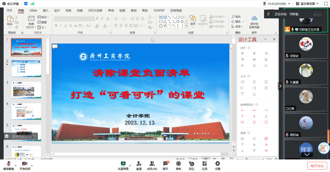 2023年12月14日,会计学专业教研室召开专业教研室线上会议,会议主题为《清除课堂负面清单,打造“可看可听”的课堂》。本次教研室线上会议由会计学专业教研室邓晔莹主任主持,并有71名专任教师积极参与本次线上会议。